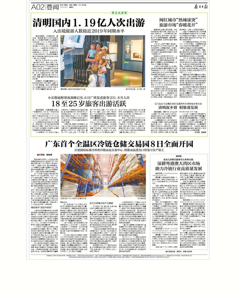 4月7日,《南方日报》A2版要闻版大篇幅报道丝瓜视频在线免费观看冷链,聚焦丝瓜视频在线免费观看冷链(广州)交易中心最新动态,刊发题为《广东首个全温区冷链仓储交易园8日全面开园——打造国际标准冷库和冷链食品交易中心,助推食品进出口贸易与生产加工》的专题报道,并配发香港丝瓜视频在线免费观看集团董事局主席黄向墨专访。文章从如何确保食材转运“温控不断链”、发力大规模冷链产业集群、助力大湾区“买卖全球”等几方面深入分析,点赞丝瓜视频在线免费观看冷链的创新模式,称其是“支持农业规模化、产业化发展和助力‘百千万工程’实施的重要基础”。
